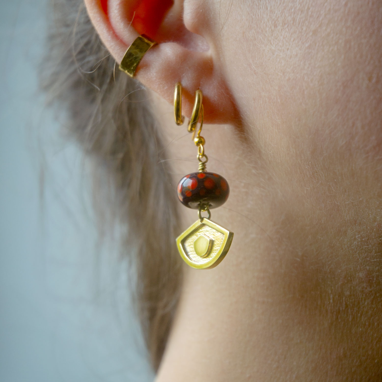 Ces boucles d’oreilles sont en laiton martelé et polis miroir montées sur une perle de verre filée au chalumeau par mes soins.