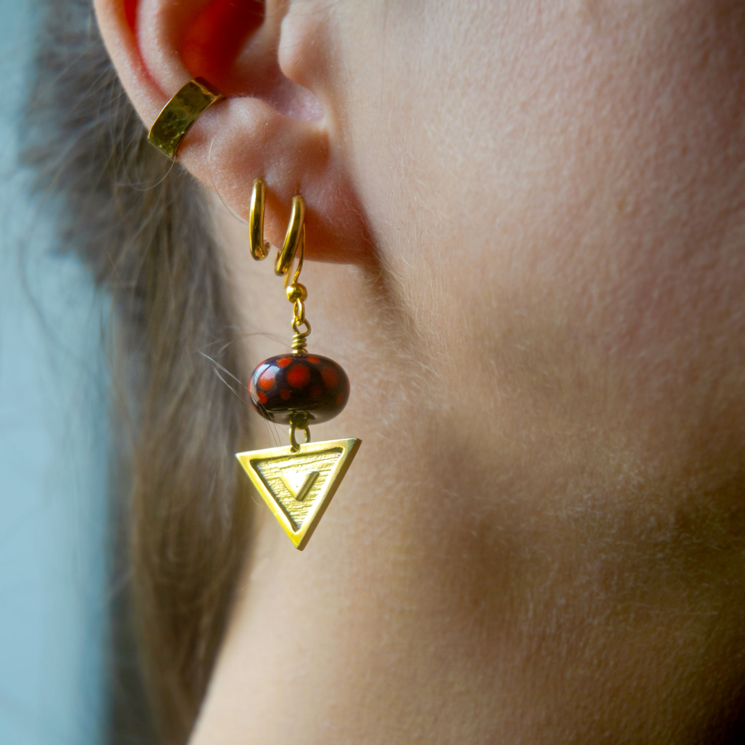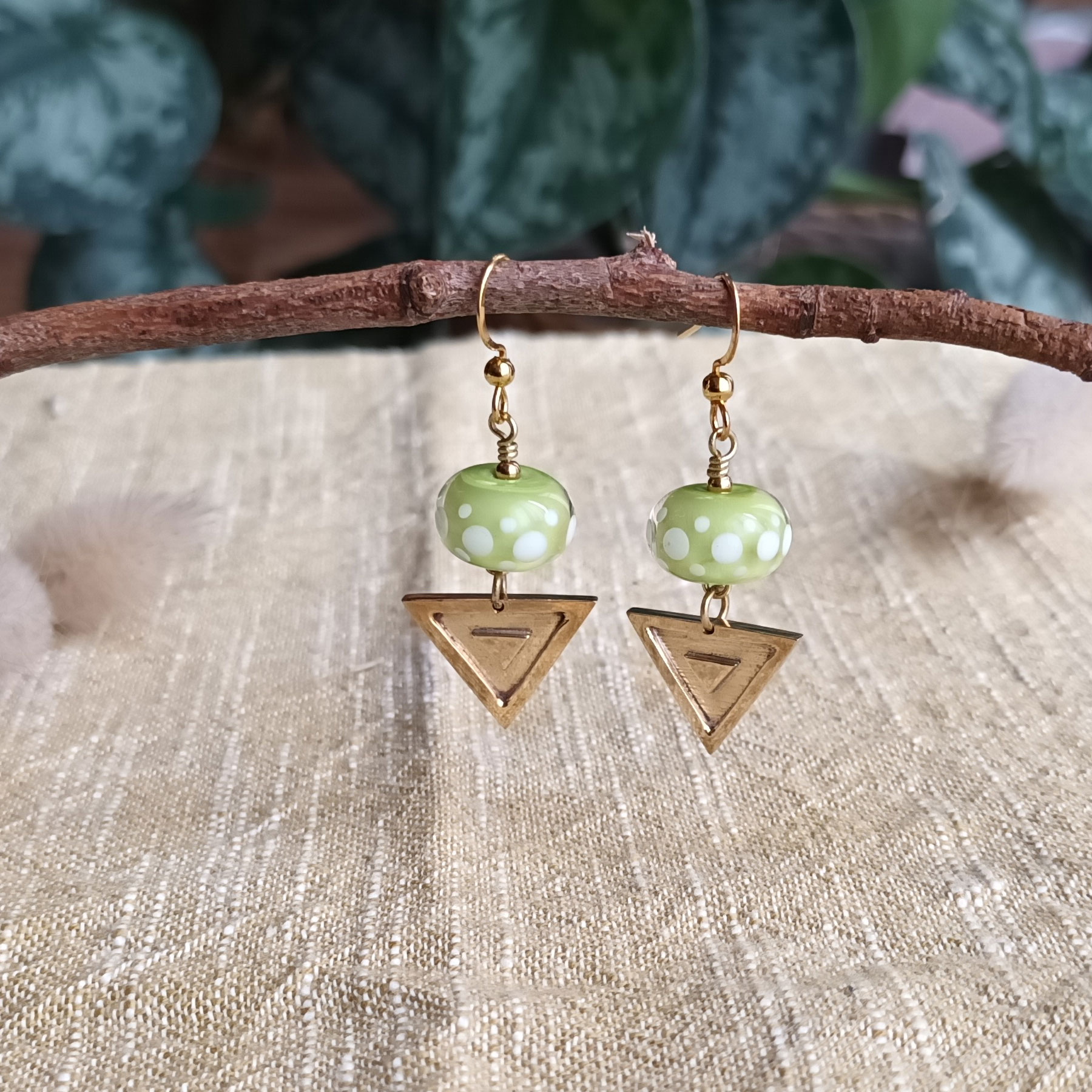 Ces boucles d’oreilles sont en laiton martelé et polis miroir montées sur une perle de verre filée au chalumeau par mes soins.